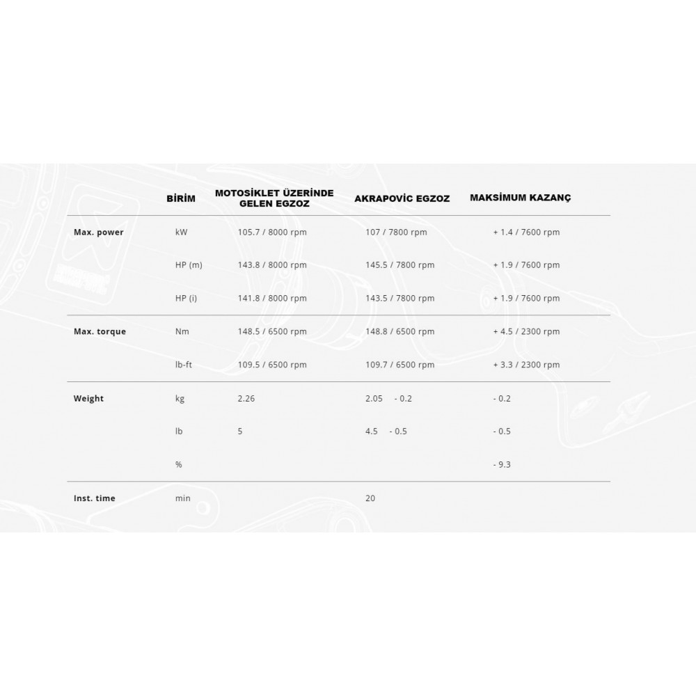 BMW GS serisi motorlar ile uzun yıllara dayanan çalışma deneyiminden yola çıkılarak özel olarak BMW R 1300 GS için geliştirildi. Hafif titanyumdan yapılmış çift akışlı susturucu ve el yapımı karbon fiber uç kapağı, standart stoğa göre %9,3 oranında ağırlık tasarrufu sağlar. Derin, dolgun bir ses sunarken çevre üzerindeki etkiyi azaltan gelişmiş performans ve gelişmiş ses susturma için tasarlandı. Susturucudaki özel profilli yüzey güç ve dayanıklılık katar ve işlenmiş bir logo ile tamamlanır. Güç ve tork, 7.600 devir/dakikada 1,4kW (1,9hp) ve 2.300 devir/dakikada 4,5Nm artış gösterir. Bu rakamlar, Akrapovič dyno'da standart egzoz kullanılarak BMW R 1300 GS'ye karşı arka arkaya yapılan çalışmalarda elde edildi. EC/ECE tipi onayı, yeniden eşleme gerektirmeyen basit tak ve çalıştır kurulumludur. Sistem BMW Motorrad'ın yan kasalarıyla tamamen uyumludur.